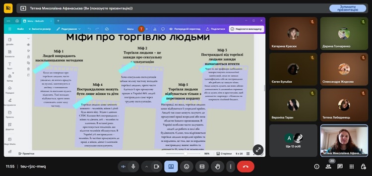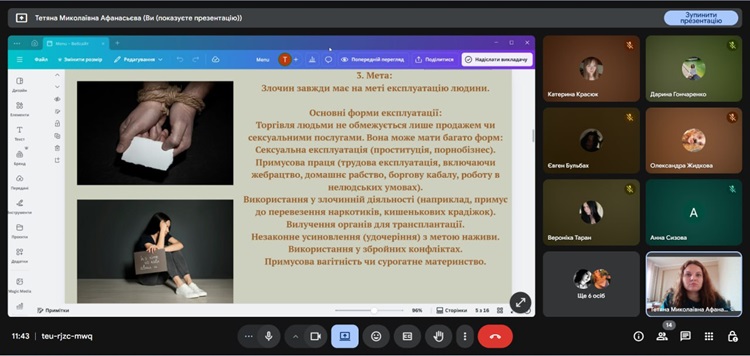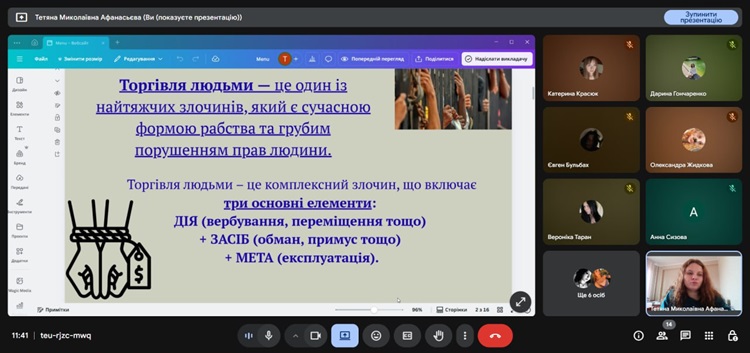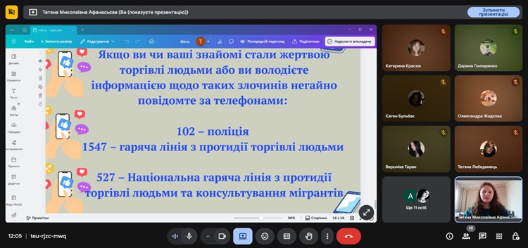 17.10.2025 в закладі освіти соціальним педагогом Тетяною Афанасьєвою було підготовлено та проведено заняття для здобувачів освіти з поширення інформації про торгівлю людьми та як вберегтися від неї. Під час заняття діти були ознайомлені з поняттям, складовими етапами торгівлі людьми, переглянули відео ролики про те, як підготуватися до подорожі за кордон та розглянули міфи, які існують в суспільстві щодо цього. Також здобувачі освіти були ознайомлені з відповідальністю за вчинення злочину торгівлі людьми, яке передбачено законодавством України.