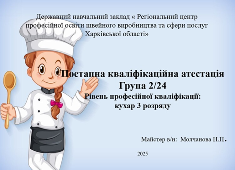 У ДНЗ «Регіональний центр професійної освіти швейного виробництва та сфери послуг Харківської області» проведено поетапну кваліфікаційну атестацію у групі №2/24, професія: «Кухар; Кондитер», рівень професійної кваліфікації : кухар 3 розряду, майстер виробничого навчання: Наталія МОЛЧАНОВА, викладач предметів професійно-теоретичної підготовки, голова методичної комісії – Ольга ІВАЩЕНКО.