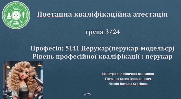У ДНЗ «Регіональний центр професійної освіти швейного виробництва та сфери послуг Харківської області» проведено поетапну кваліфікаційну атестацію у групі 3/24. Професія: перукар (перукар-модельєр); рівень професійної кваліфікації: перукар, майстри виробничого навчання: Наталія ЛОГВІН, Євгеній ГРІНЧЕНКО, викладач професійно-теоретичного навчання.