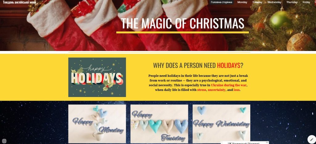 На сайті закладу освіти до тижня англійської мови можна знайти щоденні завдання, присвячені Різдву, квести, цікаві відео, ігри та відеорецепти різдвяних страв. Так само там можна ознайомитись з правилами проведення Тижня та Планом Тижня.