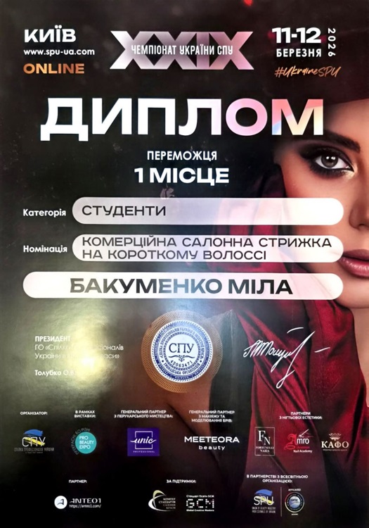 - 🥇 1 місце — Бакуменко Міла (гр.3/24) Номінація: «Комерційна салонна стрижка на короткому волоссі»