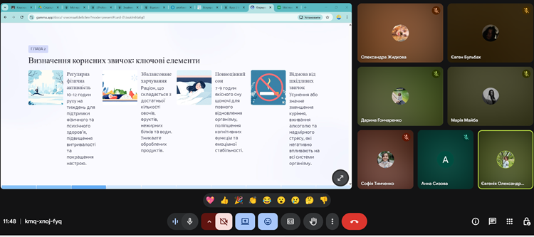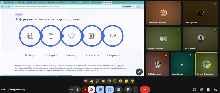 Ми з’ясували, чому здоровий спосіб життя – це цінність, визначили ключові елементи формування корисних звичок, сформували чіткий план дій та поділились власними корисними звичками: від активної ходьби до читання книг. Також був створений чіткий чек-лист “5 кроків до здорового ранку”.