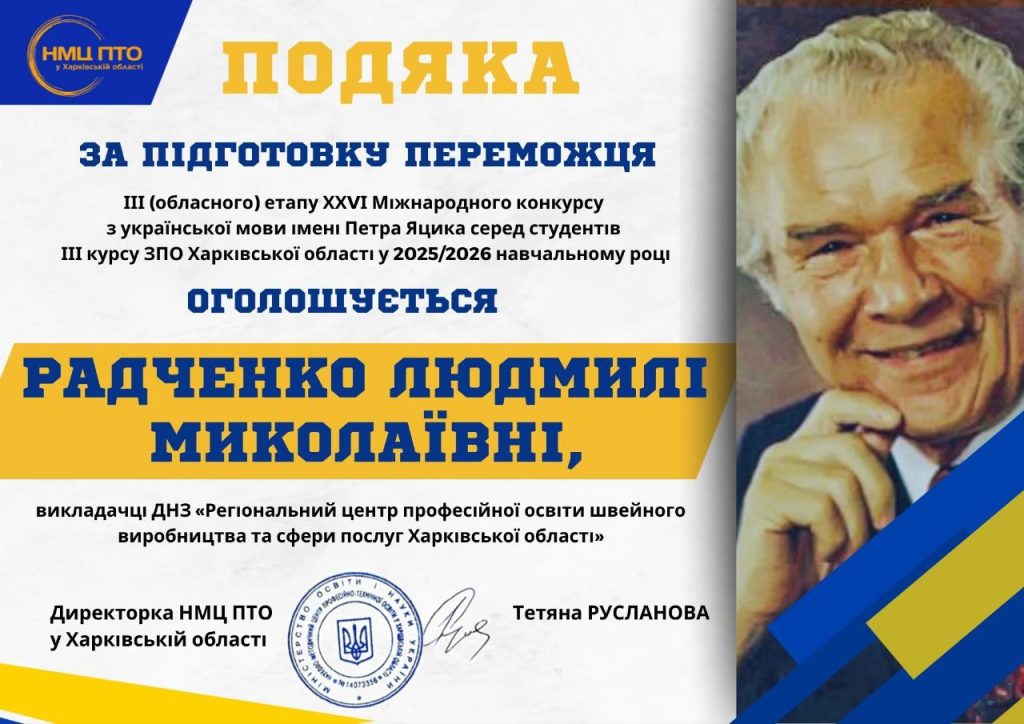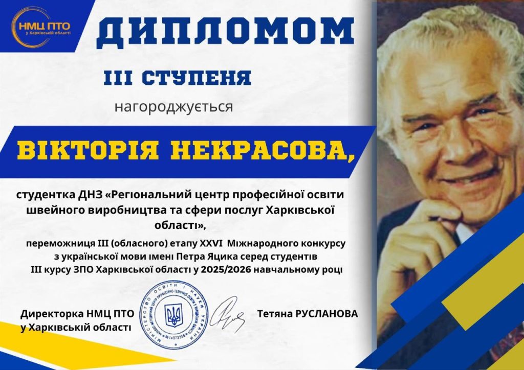 Щиро вітаємо з ІІІ місцем в обласному етапі ХХVІ Міжнародного конкурсу з української мови імені Петра Яцика серед студентів ІІІ курсу ЗПО Харківської області у 2025/2026 навчальному році! Вітаємо студентку ДНЗ «Регіональний центр професійної освіти швейного виробництва та сфери послуг Харківської області» — Некрасову Вікторію.