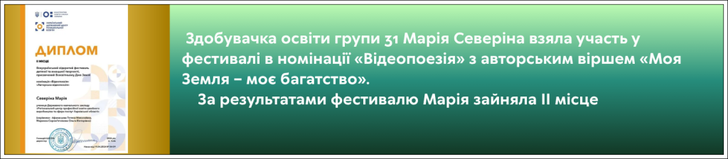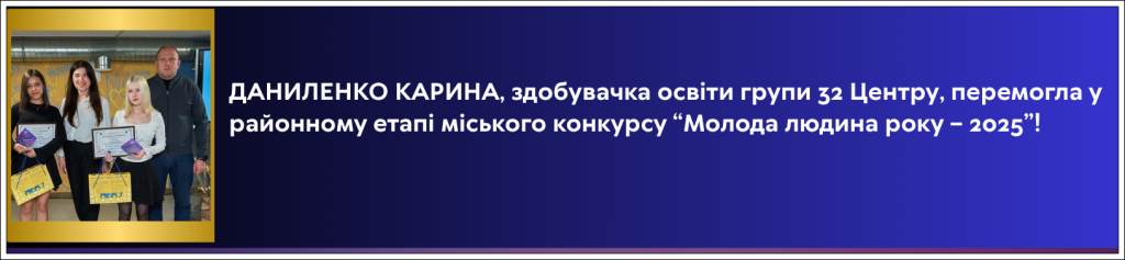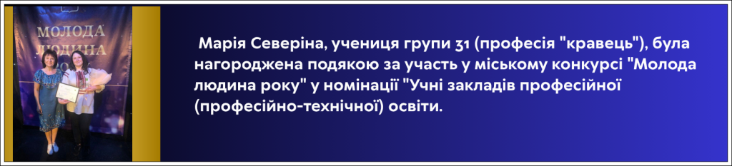 Здобувачка освіти Северіна Марія Романівна, учениця групи 31, здобула перше місце у номінації “Учні закладів професійної (професійно-технічної) освіти” на районному етапі міського конкурсу “Молода людина року”.