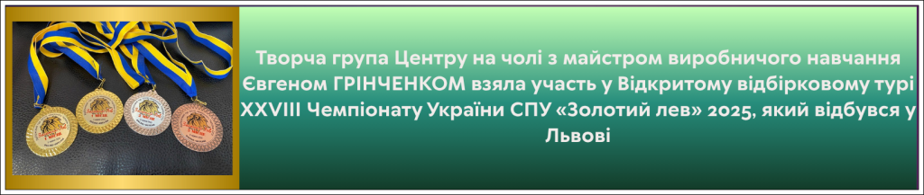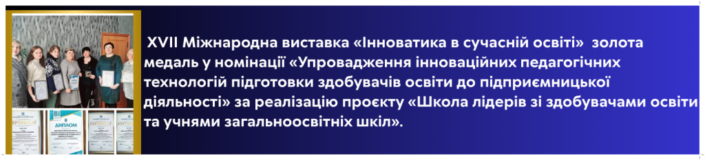 Проєкт, розроблений творчою групою педагогів, за темою «Інноваційні інструменти у професійній освіті – запорука формування практичних навичок у молоді для відбудови України»,у тематичній  номінації «Інноваційні освітні інструменти для професійної освіти: практичні навички для відбудови України» П’ятнадцятої  Міжнародної виставки«Інноватика в сучасній освіті»(25-27.10. 2023, м. Київ),  отримав золоту медаль.