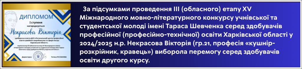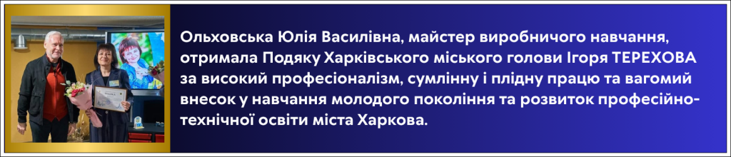 Здобувач освіти групи 21 з професії “Кравець” Альона Іщук стала лауреатом  міського  конкурсу «Молода людина року – 2023» в номінації «Учні закладів професійної (професійно-технічної) освіти» та отримала Подяку Харківського міського голови Ігоря Терехова