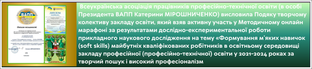 • Експеримент регіонального рівня за темою: «Формування м’яких навичок (soft skills) майбутніх кваліфікованих робітників в освітньому середовищі закладу професійної (професійно-технічної) освіти»